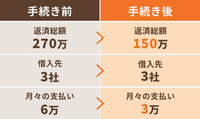 対応いただいたところ、なんと月々の返済が6万円から3万円に!無理なく返済ができるようになり、借金を重ねる心配もなくなりました。もっと早く相談していれば良かったと思います。